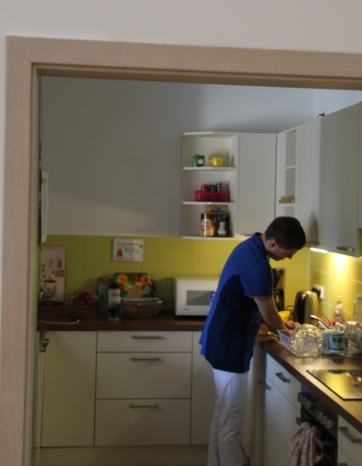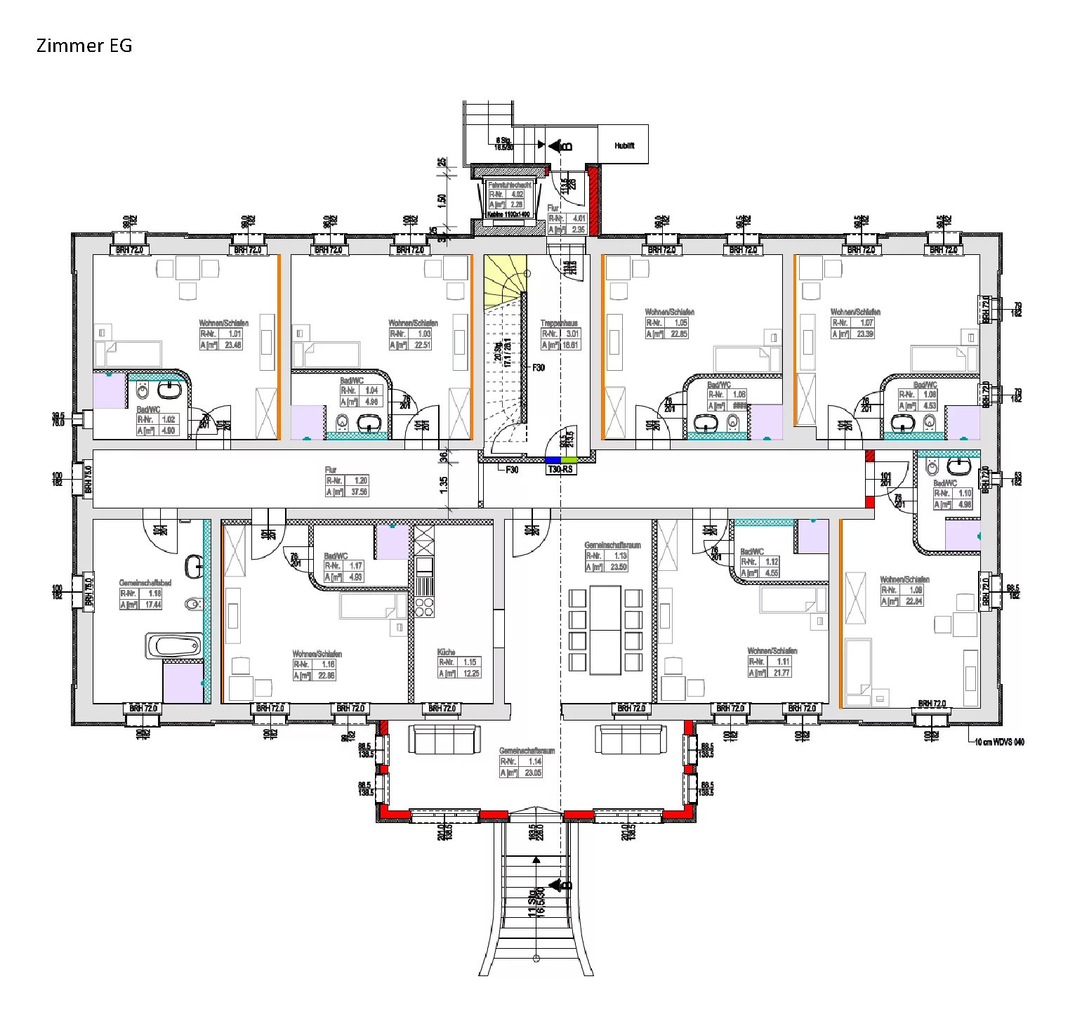 Das zweigeschossige Haus verfügt über eine Gesamtfläche von 650 m² und ist vollständig barrierefrei gestaltet. Es beherbergt 12 großzügige Einzelzimmer (je 21 bis 36 m²) sowie eine Pärchenwohnung mit 55 m².